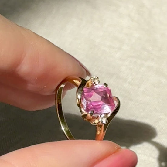 Materials: Solid 10k yellow gold, pink lab sapphire (8.3mm in size, approximately 1.1 carat), clear quartz accents. Weighs 2.2 grams.